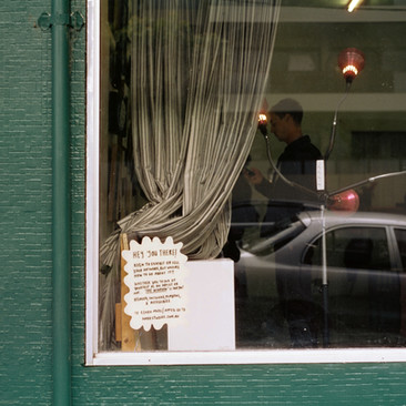 Stripy curtains blocking off visibility to shop / gallery space behind